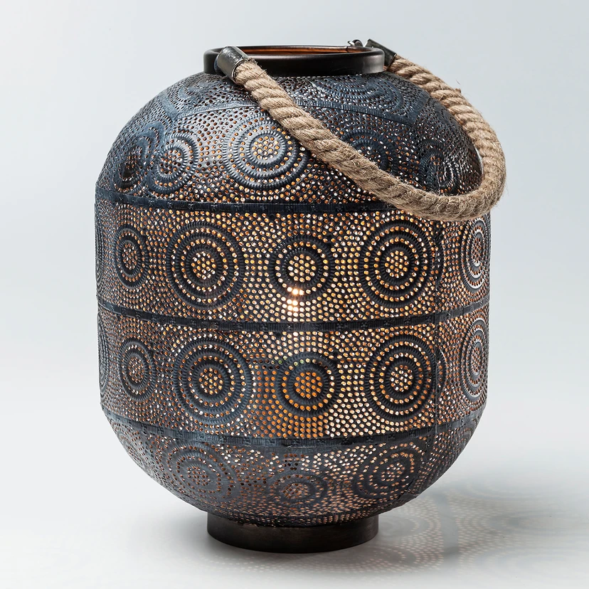 Die Bodenleuchte Sultan kommt ganz besonders orientalisch daher, denn ein zauberhaftes Ornamentmuster ziert den Schirm aus Metall. Dabei ist das Muster nicht bloß aufgemalt oder in den Schirm geprägt, sondern stellt ein feines Lochmuster dar, das nicht nur in puncto allgemeiner Optik sehr wirkungsvoll ist, sondern auch zu einem höchst stimmungsvollen Lichtbild beiträgt. Schaltet man nämlich die innenliegende Lichtquelle ein, dann entsteht ein atemberaubendes Spiel aus Licht und Schatten und das Muster, das man zuvor nur auf dem Leuchtkörper gesehen hat, scheint auch die Umgebung der Leuchte ganz und gar zu erfüllen. Dabei kann man Sultan, die mehr als deutlich an eine Vase erinnert, sehr schön als Bodenleuchte verwenden, weil sich das so stimmig in den Raum einpasst, aber selbstverständlich kann man sie auch auf einer Erhöhung wie einem kleinen Beistelltisch oder einer stilvollen Kommode platzieren.