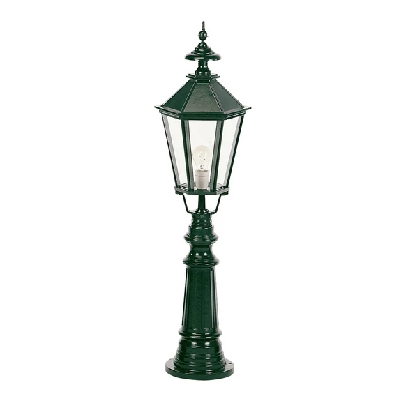 Diese Wegeleuchte überzeugt mit einer stabilen Bauart und ist in ihrem antiken Design immer wieder schön anzusehen. Die glänzende Lackierung wirkt immer stilvoll und fügt sich in unterschiedlichste Außenbereiche ein. Eine formschöne Spitzhaube krönt diese Leuchte und unterstreicht das elegante Design.