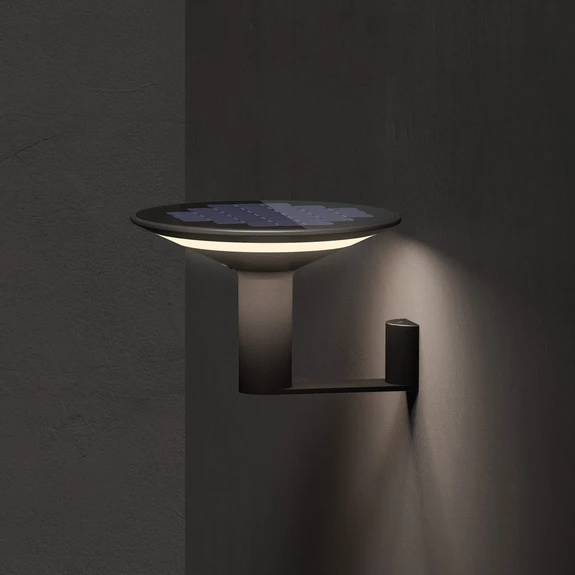 Als autonomer Zusatzlichtspender an der Fassade oder neben dem Eingang in modern konzipierten Umgebungen bietet sich die anthrazitfarbene LED-Solarleuchte Keope aus Aluminium an. Die Wandleuchte benötigt dank Tageslichtsensor, Solarmodul und Akku keinerlei externe Stromversorgung oder Steuerung. Sie ist mit einem runden Kopf ausgestattet; das Licht der warmweißen Lichtquelle wird durch einen schmalen, umlaufenden Austritt an der Unterseite abgegeben.