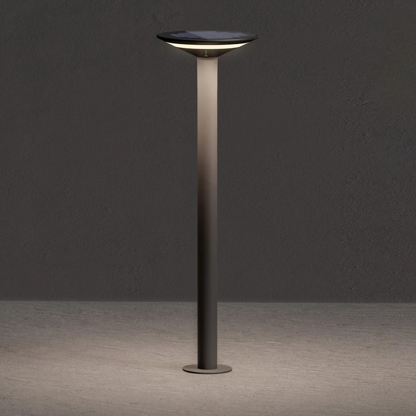 Als autonomer Zusatzlichtspender für Fußwege und Zufahrten in modern konzipierten Außenanlagen bietet sich die anthrazitfarbene LED-Solarleuchte Keope aus Aluminium an. Die Wegeleuchte benötigt dank Tageslichtsensor, Solarmodul und Akku keinerlei externe Stromversorgung oder Steuerung. Sie ist mit einem runden Kopf ausgestattet; das Licht der warmweißen Lichtquelle wird durch einen schmalen, umlaufenden Austritt an der Unterseite abgegeben.