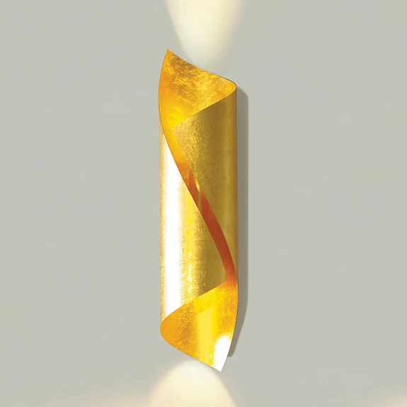 Italienische Handwerkskunst verbirgt sich hinter der Wandlampe Hué, die in Handarbeit hergestellt wird. Der Korpus besteht aus Stahl, der mit Blattgold belegt wird und die Wandlampe komplett in einem edlen Goldfinish erstrahlen lässt. Der zylindrische Lampenschirm erscheint leicht asymmetrisch, da das Rechteck, aus dem der Schirm geformt wird, bei der Verarbeitung leicht gedreht wird. Licht entweicht sowohl nach oben als auch nach unten. Nach vorne kann durch den kleinen Schlitz auch ein wenig Licht entweichen.