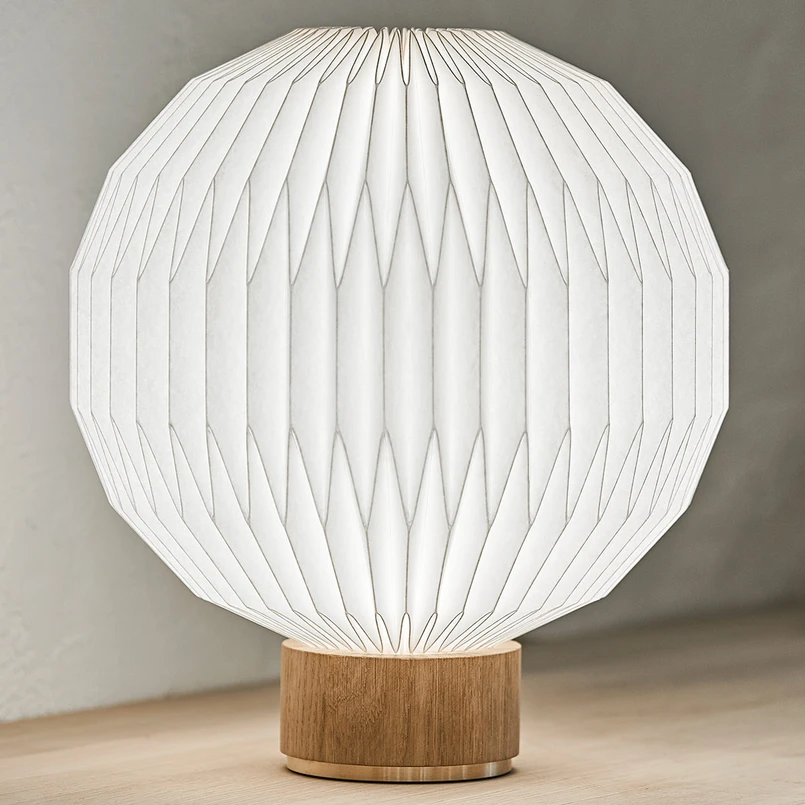 Das Modell 375 ist eine Tischleuchte, die ihr Vorbild in der Tischleuchte 107 von Esben Klint aus dem Jahre 1942 hat. Anlässlich des 75. Firmenjuliäums hat das Designteam von LE KLINT eine Neuinterpretation geschaffen, bei der der aus Kunststoff gefaltete, runde Leuchtenschirm von einem kleinen, runden Fuß aus Messing und heller Eiche getragen wird. Der weiße Schirm lässt das Licht sanft brechen und warme Akzente im Raum schaffen. Die Zuleitung enthält einen Schalter zum Ein- und Ausschalten.