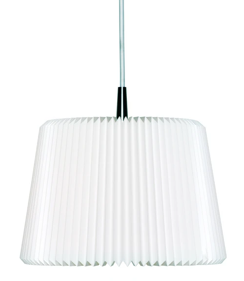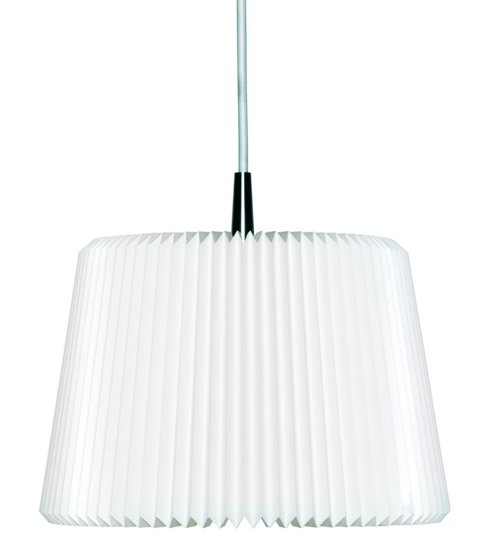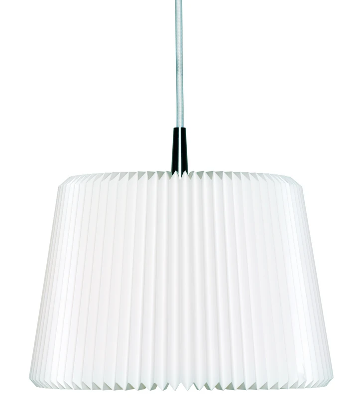 Aus weißem Kunststoff wurde der Schirm der Hängeleuchte Snowdrop von Hand gefaltet. Diese Falttechnik ist das Markenzeichen des dänischen Herstellers, der seine Leuchtenkreationen seit nunmehr 75 Jahren in Dänemark produziert. Bis heute ist es nicht gelungen, diese besondere Falttechnik duch Maschinen bewältigen zu lassen, so dass die Leuchtenschirme noch heute wie zur Gründerzeit des Leuchtenunternehmens von professionellen Falterinnen und Faltern in Handarbeit gefertigt werden, so dass jeder Leuchtenschirm zum Unikat wird.