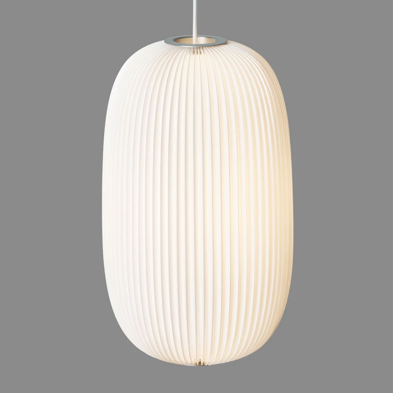 Der voluminös wirkende Lampenschirm von Lamella ist geschlossen und besteht aus lauter kleinen Längsfalten, die wie Lamellen wirken. Die weiße, leicht glänzende und transluzente Folie wurde dafür von Hand gefaltet und geformt.