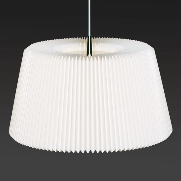 Aus weißem Kunststoff wurde der Schirm der Hängeleuchte Snowdrop von Hand gefaltet. Diese Falttechnik ist das Markenzeichen des dänischen Herstellers, der seine Leuchtenkreationen seit nunmehr 75 Jahren in Dänemark produziert. Bis heute ist es nicht gelungen, diese besondere Falttechnik duch Maschinen bewältigen zu lassen, so dass die Leuchtenschirme noch heute wie zur Gründerzeit des Leuchtenunternehmens von professionellen Falterinnen und Faltern in Handarbeit gefertigt werden, so dass jeder Leuchtenschirm zum Unikat wird.
