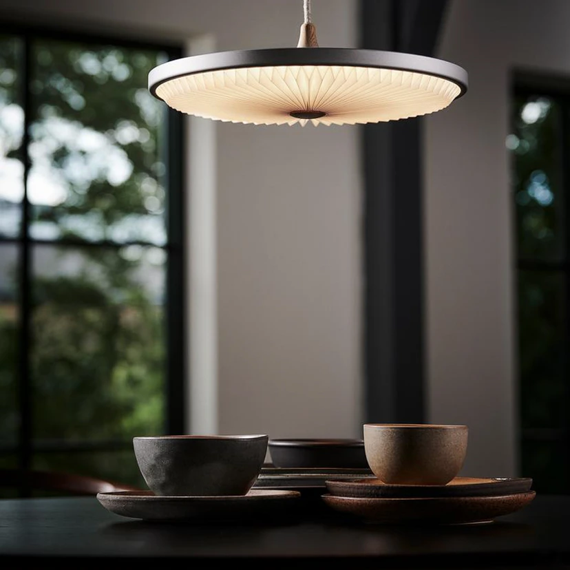 Die LED-Hängeleuchte Soleil versprüht ein Flair von Reinheit und Frische aufgrund ihrer schlanken Gestalt und der flachen, modernen Schirmform. Der handgefaltete Lampenschirm besteht aus UV-beständigem FSC-zertifiziertem Papier, natürlicher Flachskordel und attraktiven Holzdetails die in den Aluminiumkörper eingelassen sind. Sie bietet eine schlichte und zugleich geschmackvolle Farbkomposition. Durch das schlanke Design lässt sich Soleil flexibel in verschiedenen Innenräumen einsetzen und erzeugt eindrucksvolle Lichteffekte durch die Falten. Über einem Esstisch zu Hause, in einem Restaurant oder einem geschäftlichen Besprechungsraum kommt sie gleichermaßen gut zur Geltung.