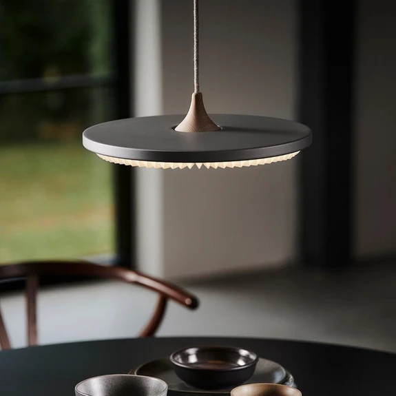 Die LED-Hängeleuchte Soleil des Designers Philip Bro Ludvigsen wirkt elegant und modern. Sie besticht durch den eleganten und flachen Leuchtenschirm. Dank breiter Lichtausstrahlung lässt sich die Leuchte perfekt in der Küche einsetzen. Der natürliche Look wird durch eine Holzumrandung an der Fassung ergänzt.