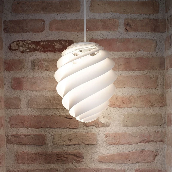 Die Pendellampe Swirl ist ein neueres Modell, das der Designer Øivind Slaatto in den vergangenen Jahren entwickelt hat. Inspiriert von der Form eines Schneckenhauses und getreu seinem Motto, dass Licht, Form und Funktion bei einer Leuchte Hand in Hand gehen sollten, ist die Serie Swirl entstanden. Der Kunststoffschirm erlaubt dem Licht, durch die Zwischenräume zu entweichen und so den Raum nicht nur in Allgemeinlicht zu tauchen, sondern auch interessante Lichteffekte zu erzielen.