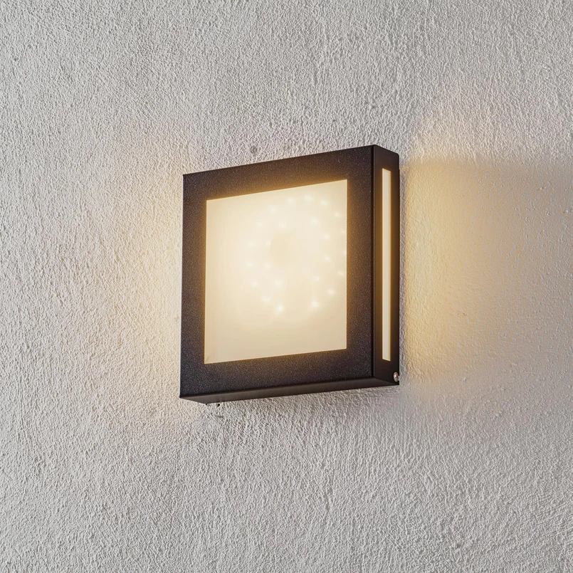Aus einem anthrazitfarbenen, pulverbeschichteten Edelstahlrahmen sowie einem quadratischen Leuchtkörper aus Opalglas besteht die LED-Außenwandleuchte Legendo Mini, die eine auffällige Fassadenbeleuchtung ermöglicht. Das Licht strahlt nach vorne ab, tritt aber auch mittels zweier Lichtaustritte an den Seiten nach links und rechts aus und malt leuchtende Akzente auf die Hauswand.
