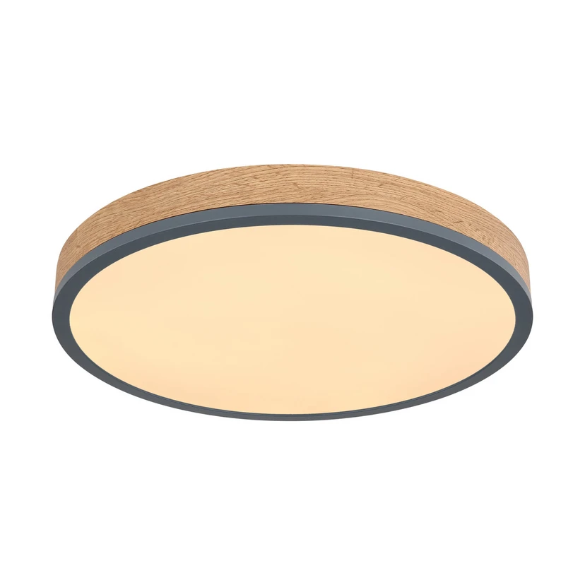 Die runde Deckenleuchte Doro begeistert mit modernem Design. Der opalfarbene Kunststoff, der die verbauten LED-Leuchtmittel bedeckt, sorgt für eine blendfreie Lichtabgabe. Das Gehäuse aus grafitfarben lackiertem Metall und dunklem MDF-Holz verleiht jedem Raum eine wohnliche Nuance. Die Lichtfarbe kann stufenlos eingestellt werden (Warmweiß bis Tageslicht). Mit Nachtlichtfunktion und Timer ausgestattet. Über die mitgelieferte Fernsteuerung (inkl. zwei AAA-Batterien) oder über den externen Wandschalter bedienbar.
