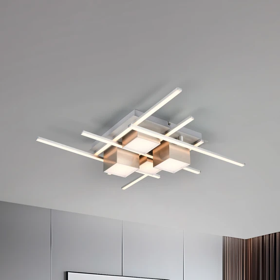 Die LED-Deckenlampe Roger vereint modernes Design mit funktionaler Vielseitigkeit. Gefertigt aus Metall, besticht sie durch ihre moderne Form mit langen, stabförmigen und vier quadratischen Lichtelementen. Die Leuchte passt in viele Einrichtungen. Die integrierte LED-Lichtquelle bietet eine beeindruckende Farbtemperaturspanne von warmweißem Licht bis hin zu tageslichtweißer Beleuchtung, die dank der mitgelieferten Fernbedienung stufenlos angepasst werden kann. Diese Flexibilität ermöglicht es, die Beleuchtung optimal an die jeweilige Stimmung oder Aktivität anzupassen.
