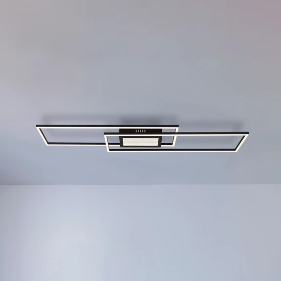 Die Deckenleuchte Saunders im länglichen Design mit zwei versetzten Rechtecken bietet eine moderne Beleuchtungslösung. Der schwarze Metall-Korpus und der Schirm aus Aluminium in Schwarz, Matt und opalem Kunststoff erzeugen einen beeindruckenden 3D-Effekt. Mit einem hohen Lichtstrom und der steuerbaren Lichtfarbe (CCT) von Warmweiß bis Tageslicht bleiben bei der LED-Deckenlampe Saunders keine Wünsche offen.