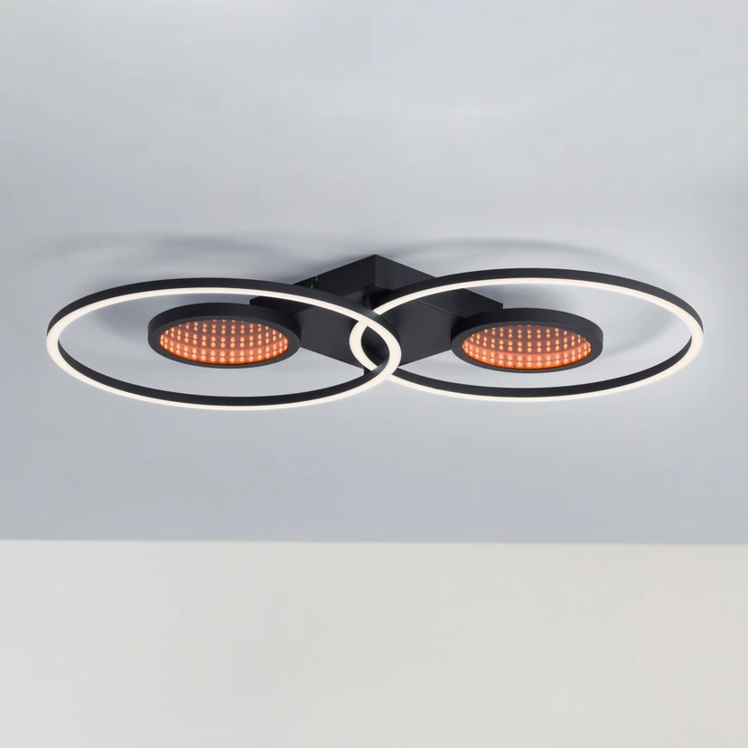 Die aus Eisen, Aluminium und Kunststoff bestehende LED-Deckenleuchte Tunel setzt sich aus zwei kleinen Kreisen sowie zwei großen Kreisen zusammen, die am quadratischen Baldachin angebracht sind. Die großen, äußeren Ringe geben weißes Licht ab. Hier lässt sich die Farbtemperatur von warmweiß bis universalweiß einstellen. Die kleinen Ringe im Inneren erstrahlen hingegen in buntem RGB-Licht.