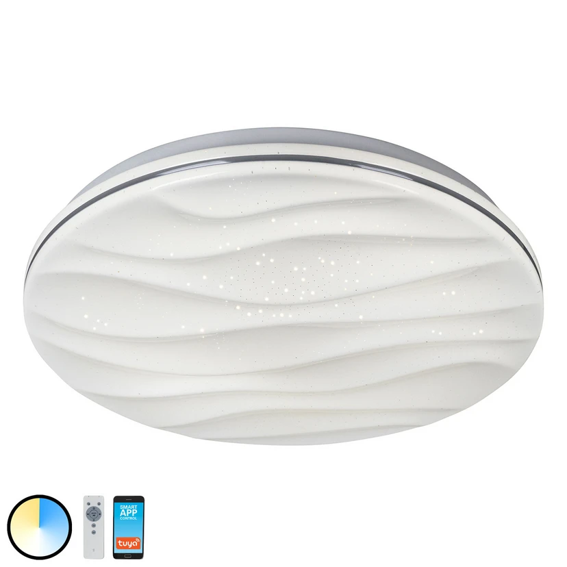 Die Leuchte kann nicht nur mit der mitgelieferten Fernbedienung gesteuert werden. Nach der Einbindung mit der kostenlosen Tuya Smart-App über das WLAN lässt sich Austin bequem mit dem Smartphone oder via Amazon Alexa oder Google Assistant per Sprachbefehl bedienen. Zusätzlich zum Dimmen und Wechseln der Farbtemperatur kann mit der App auch die Ein- und Ausschaltzeit (Timer-Funktion) festgelegt werden.