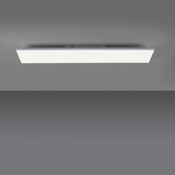 Die rechteckige LED-Deckenleuchte Yukon aus Aluminium und Eisen ist mit einem satinierten Kunststoffdiffusor bestückt, der das Licht blendfrei und gleichmäßig in die Umgebung abstrahlen lässt. Die im Lieferumfang enthaltene IR-Fernbedienung verfügt über unterschiedliche Funktionen, so dass das Licht über diese nicht nur geschaltet, sondern auch stufenlos gedimmt werden kann. Außerdem befinden sich 12 vorinstallierte Modi auf der Fernbedienung, die auf Knopfdruck unterschiedliche Lichtstimmungen, wie zum Beispiel bei einem Sonnenuntergang, erzeugen. Neben einem dynamischen Farbwechsel lässt sich die Lichtfarbe auch konstant einstellen und beliebig mischen, auch verschiedene Weißtöne sind hier kein Problem, so dass Yukon tolle Leuchterlebnisse im Raum schafft.