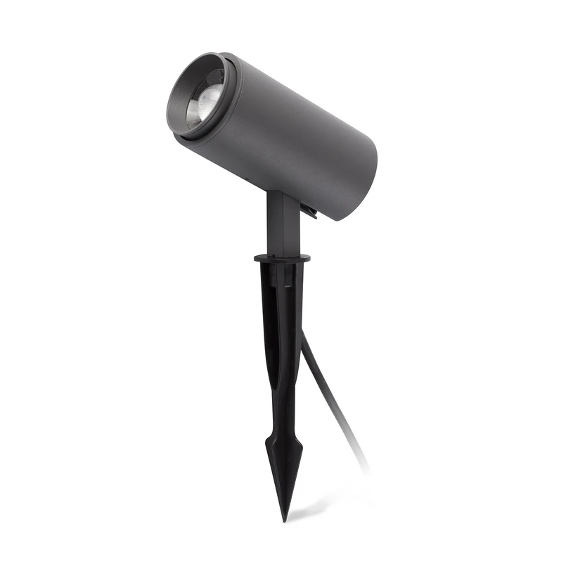Die Lichtabstrahlung lässt sich bei dem im gesamten Außenbereich einsetzbaren LED-Erdspießstrahler Plom durch den besonders gearbeiteten Leuchtenkopf wie mit einem Teleskop fokussieren. Plom wird einfach ins Erdreich oder in einen Blumenkübel gesteckt und leuchtet so jeden beliebigen Platz auf der Terrasse oder im Garten aus.