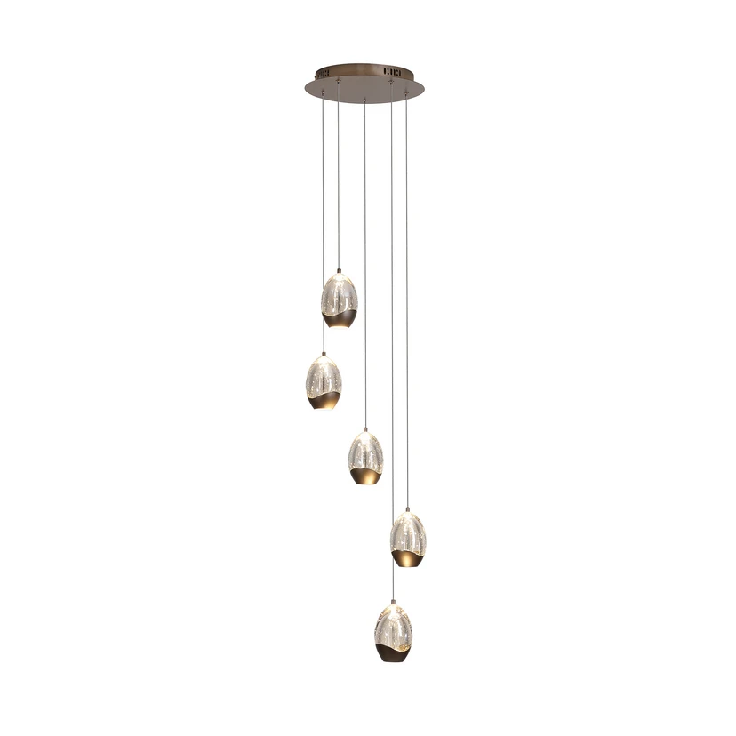 Die LED-Hängelampe Seeds mit fünf dekorativen Glasschirmen, die unterschiedlich hoch abgehängt sind, vereint stilvolles Design mit funktionaler Beleuchtung. Seeds passt ideal zu verschiedenen Raumkonzepten. Mit fünf Lichtquellen bietet sie eine gleichmäßige Ausleuchtung, die ideal für Wohn- und Esszimmer geeignet ist.