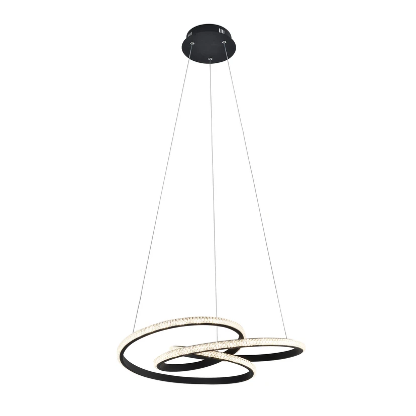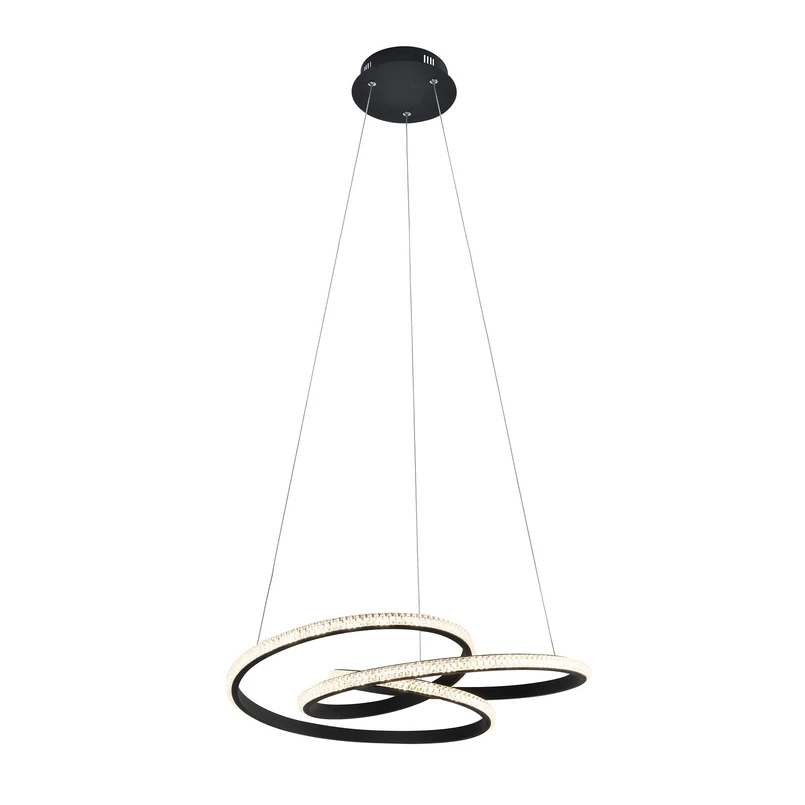 Geschwungene LED-Hängeleuchte Berlin aus mattschwarzem Aluminium Die mattschwarzen Aluminiumprofile der Hängeleuchte Berlin sind mit warmweißen LEDs und einer Acrylabdeckung ausgestattet. Sie sind so gebogen, dass sie liegende Kreise ergeben, die ineinander verschlungen sind. Die Lichtabgabe der LEDs erfolgt hauptsächlich in den Raum hinein und ist weniger nach unten gerichtet. Mit dem minimalistischen Design der Leuchte kann man moderne Wohnräume stilsicher ausstatten.