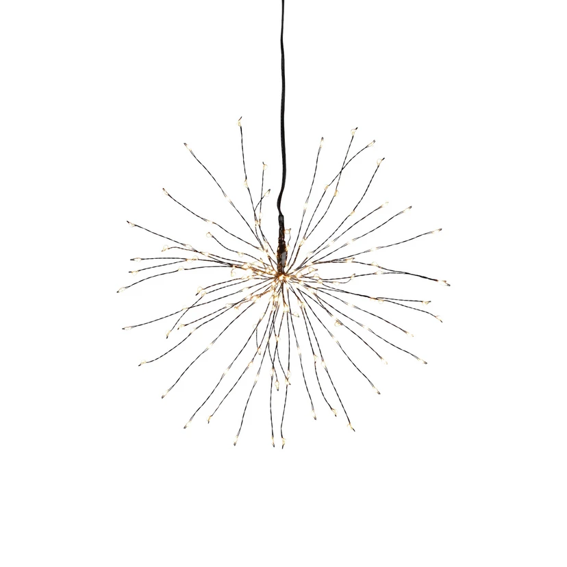 Wie der Name bereits andeutet, erinnert diese LED-Hängeleuchte an ein Feuerwerk. An nach außen strebenden Strahlen sind zahlreiche warmweiße LEDs integriert, die ein funkelndes Lichtschauspiel erzeugen. Die LED-Hängelampe Firework ist mit einem Steckerkabel ausgestattet, sodass die Stromversorgung über eine Steckdose erfolgen kann.