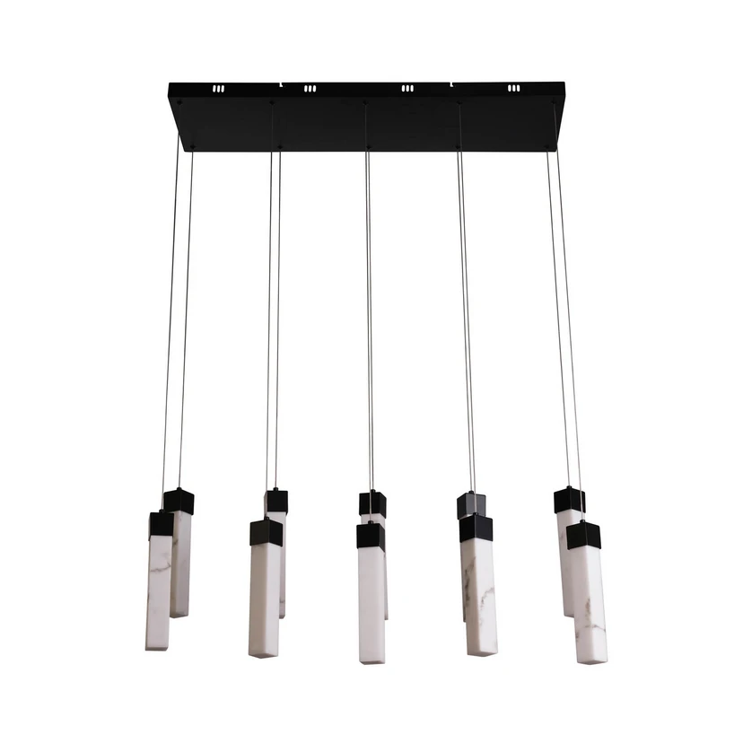 Moonbeam ist eine außergewöhnlich herausragende Pendelleuchte mit 10 Leuchten. Jedes der 10 vom eckigen Baldachin abhängenden Lichtelemente besteht aus einem atemberaubenden Schirm aus natürlichem Selenitstein, der an einer schwarzen Metallstange aufgehängt ist. Dieser Anhänger bietet eine schöne Beleuchtung, wo immer er montiert wird, zum Beispiel über einem langen Esstisch.