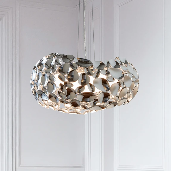 Unregelmäßig geformte, meist ovale Metallelemente mit verchromter Oberfläche wurden bei der LED-Hängeleuchte Narisa zu einem außergewöhnlich geformten Leuchtenschirm aneinandergereiht. So entsteht ein bezauberndes Gebilde, das - in welchem Raum auch immer - zum Mittelpunkt wird. Die Leuchtmittel sitzen hinter einem Diffusor aus weißem Acryl, so dass sie nach unten ein gleichmäßiges Licht erzielen, während durch die zahllosen Zwischenräume des Schirmes und durch die Spiegelungen des Lichts in den gewölbten Elementen ringsum tolle Lichteffekte an Wänden und Einrichtungsgegenständen entstehen.