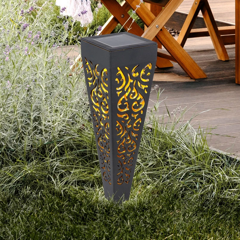 Diese Solarleuchte aus schwarzem Kunststoff (Schutzart IP44) im 3er-Set ist ideal für jeden Garten. Die 33 cm große Solarleuchte kann mit der Erdspitze ganz unkompliziert in weichem Untergrund wie z.B. in der Wiese platziert werden. Auf der quadratischen Oberseite (7x7 cm) befinden sich die Solarzellen, die tagsüber Energie für sechs bis acht Stunden sammeln. Nach unten hin wird die Solarleuchte schmaler, was dazu führt, dass sie ein elegantes Muster auf den Boden projiziert.