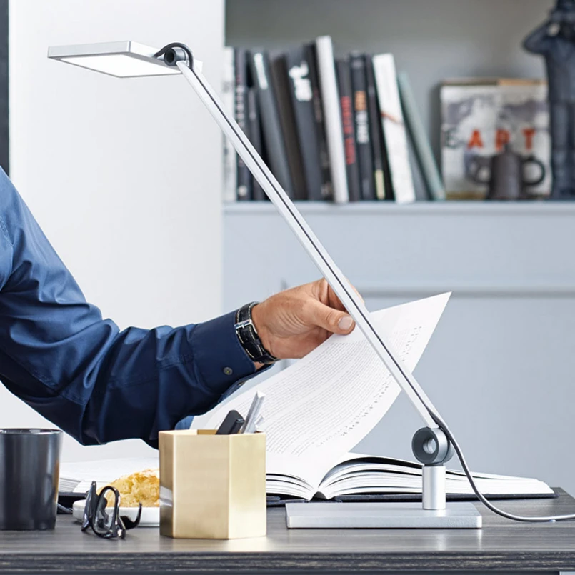 Der starre Arm ist mit einem Gelenk an den Fuß geknüpft, welches eine hohe Beweglichkeit und somit eine flexible Ausrichtung des Lichtstrahls realisiert. Weiterhin ist auch der Leuchtenkopf dreh- und neigbar. Dadurch ist eine stets optimale Beleuchtung des Arbeitsplatzes gewährleistet. In Kombination mit der stufenlosen Dimmung über eine Bedientaste am Kopf und die Einstellbarkeit der Abschaltautomatik, sowie eine hohe Farbwiedergabe bietet die Tischlampe umfassende, anpassbare Beleuchtung, die jedem Arbeitsplatz zu Gute kommt.