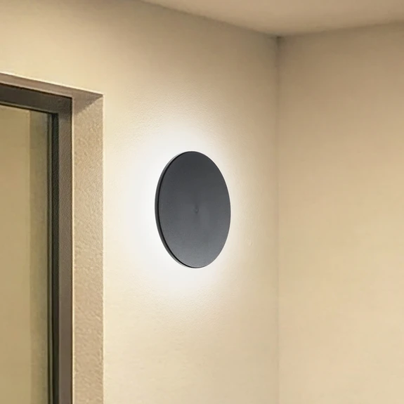 Schwarze LED-Wandleuchte Disk in rundem Design mit Schutzart IP65