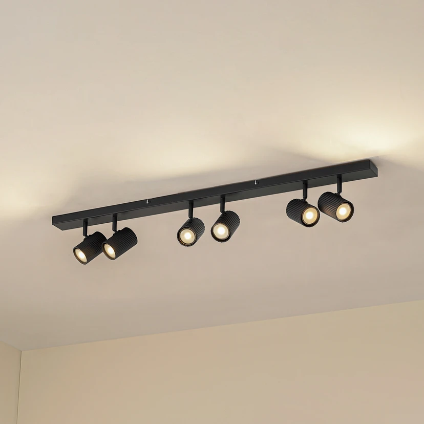 Die Deckenleuchte Kardis besticht durch ihr modernes Design und die Verwendung von hochwertigem Aluminium und Eisen. Die sechsflammige Konstruktion sorgt für eine gleichmäßige Ausleuchtung, die sowohl im Flurbereich als auch im Wohnzimmer eine angenehme Atmosphäre schafft. Die einzelnen Strahler lassen sich ganz nach Belieben ausrichten, wodurch gezielt bestimmte Bereiche oder Objekte angestrahlt werden können.
