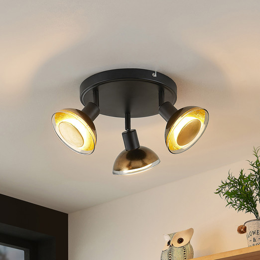 Der kompakte Aufbau des Deckenstrahlers ist äußerst praktisch. Auf der runden Befestigungsplatte sind drei Lampenschirme angebracht, die mit GU10-LED-Lampen ausgestattet sind. Die individuelle Verstellbarkeit der einzelnen Glas-Schirme bietet die Möglichkeit den Lichtaustritt an wechselnde Bedürfnisse anzupassen. Das Leuchtmittel, das direkt mitgeliefert wird, überzeugt durch Design und Funktionalität zugleich. Generell zeichnen LEDs sich durch Energieeffizienz und Langlebigkeit aus. Diese Exemplare sind durch ihre Oberfläche in Blattgold-Optik auch noch hinreißend anzusehen.