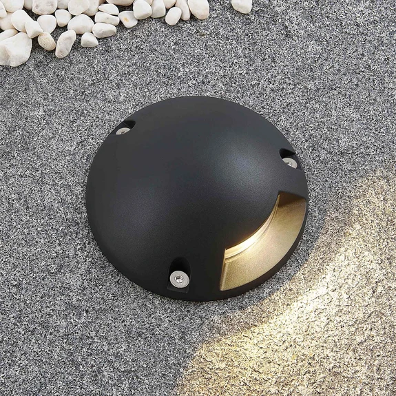 Der Leuchtenkörper der LED-Bodenaufbaulampe Huban ist rund gestaltet und wurde aus Aluminium gefertigt. Das dunkelgraue Finish lässt sich in jede modern gestaltete Umgebung optisch gut einfügen. Die Leuchte ist überfahrbar und kann bis zu 1.000 kg belastet werden. Damit kann sie in einer Einfahrt oder vor der Garage gut zum Einsatz kommen.