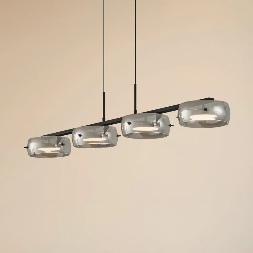 Die LED-Hängelampe Martis in Rauchgrau und Schwarz vereint modernes Design mit funktionaler Beleuchtung. Gefertigt aus Metall und Glas, fügt sich die Lampe nahtlos in zeitgemäße Wohnräume ein. Die vierflammige Konstruktion sorgt für eine gleichmäßige Ausleuchtung, während die warmweiße Lichtfarbe von 3.000 K eine angenehme Atmosphäre schafft. Die integrierte LED-Technologie garantiert nicht nur eine lange Lebensdauer, sondern auch energieeffizientes Licht, das den Raum stilvoll erhellt.
