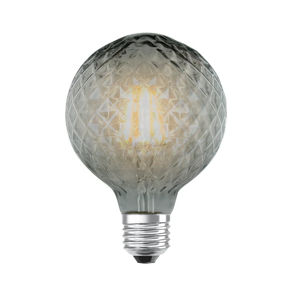 Ansprechend und markant wirkt diese E27-LED-Globelampe, denn sie hat ein ungewöhnliches Design. Die Oberfläche ist gezielt mit Unebenheiten versehen und punktet mit ihrer rauchgrauen Optik. Dieser dekorative Charakter kommt vor allem in offen gestalteten Leuchten oder Leuchten ohne einen Lampenschirm gut zur Geltung.