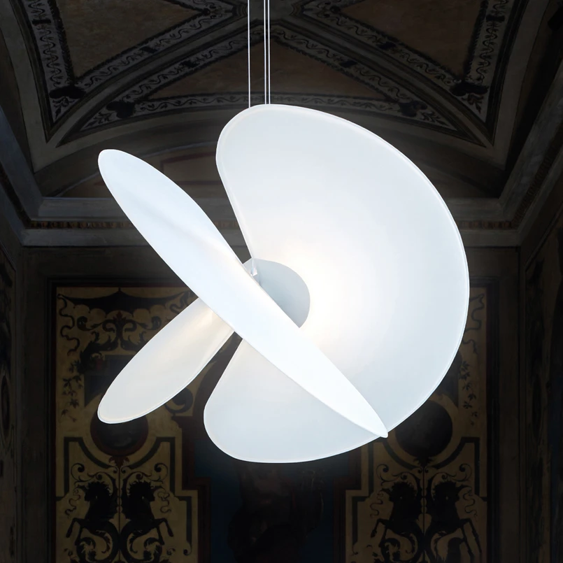 Anmutig und mit einem Hauch von Schwerelosigkeit präsentiert sich die LED-Hängeleuchte Levante von Luceplan. Der Schirm ist mit gekreuzten, weißen Fächern bestückt, deren Optik an Reispapier erinnert. Die Elemente sind magnetisch mit dem zentralen Teil der Leuchte verbunden, in dem sich die LED-Lichtquelle befindet. Diese spendet ein warmweißes Licht mit guter Farbwiedergabe, das mit einem externen Phasenabschnittsdimmer geregelt werden kann.