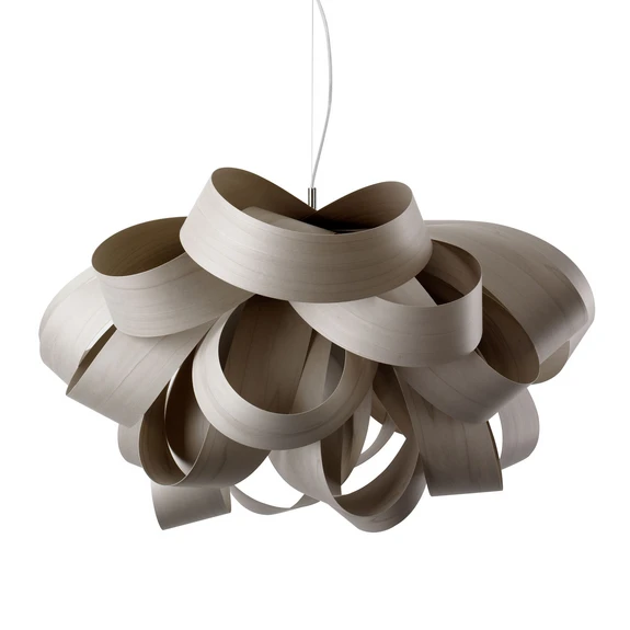 Die in zahlreichen, unregelmäßig ergänzten Schleifen angeordneten Bänder der Hängeleuchte Agatha Small bestehen aus dünnem Holzfurnier. Dieses entsteht in der hauseigenen, patentierten Timberlite®-Fertigungstechnik des Herstellers LZF. Das Ergebnis ist eine besonders elastische Schicht, die leicht geformt werden kann und dank seiner geringen Stärke sogar das Licht dezent durchscheinen lässt. Gleichzeitig behält das Holz seine natürliche Maserung, welche beim Einschalten der Lichtquelle besonders zur Geltung kommt. Je nach gewählter Lichtfarbe des Leuchtmittels zeigt sich das angestrahlte Holz in leicht unterschiedlichen Farbtönen. Damit wird Agatha Small zu einem außergewöhnlichen Beleuchtungskörper, der sein Licht sanft nach unten in den Raum abgibt und sich auch im ausgeschalteten Zustand als absoluter Blickfang präsentiert.