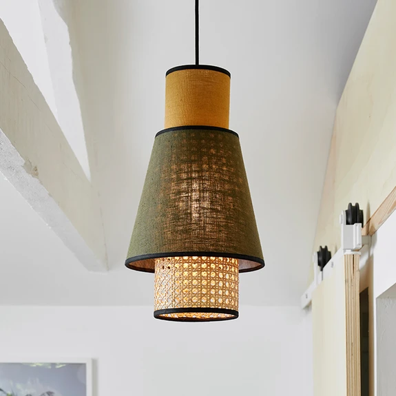 Der besondere Clou von Singapour XS ist der Schirm, genauer gesagt, die Kombination von zwei unterschiedlich großen Leinenschirmen und einem unter dem unteren Stoffschirm sitzenden, konischen Schirm aus Rattangeflecht. Im Zuge der Lichtabstrahlung zeichnet sich das Geflecht unter dem Stoff deutlich ab. Eine Pendelleuchte, die sich z. B. hervorragend für die stimmungsvolle Ausleuchtung eines Tisches eignet oder für die Grundbeleuchtung in Wohn- und Schlafräumen. Mit Textilkabel bestückt.