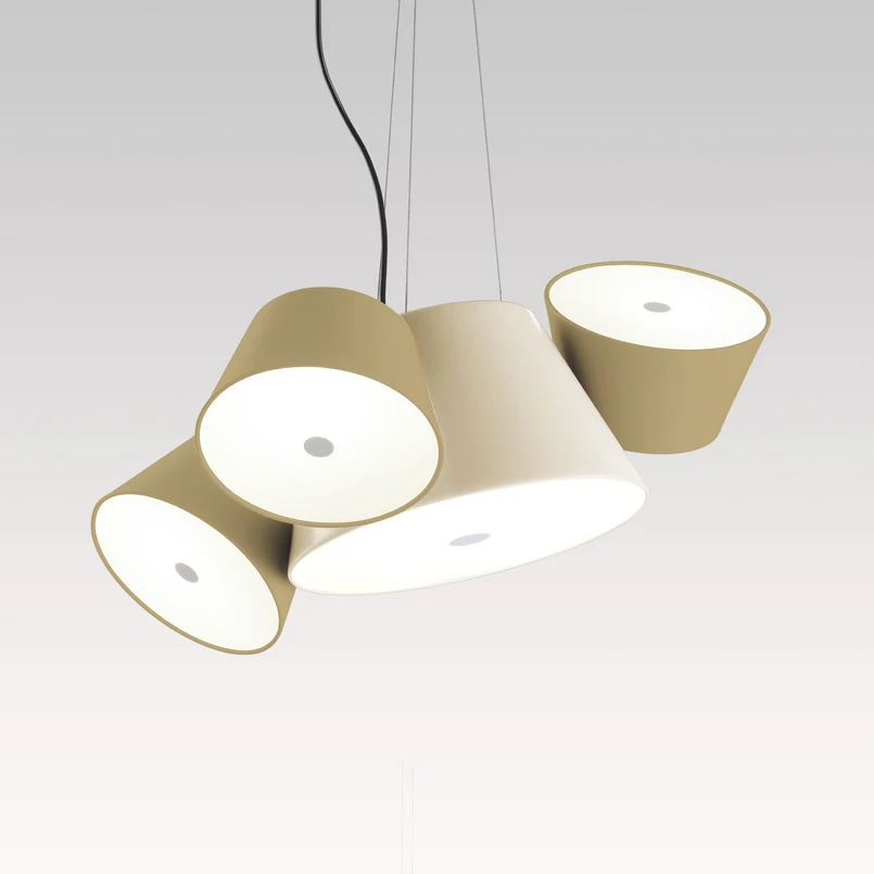 Durch die Wahl der entsprechenden Leuchtmittel kann somit die Lichtstimmung beeinflusst werden und bei Bedarf lassen sich die Schirme mit unterschiedlichen Lampen ausrüsten. Alle Schirme sind mit einem opalweißen Diffusor ausgestattet, so dass eine homogene und blendfreie Lichtabgabe gewährleistet wird. Getragen wird Tam Tam Mini von drei Seilen, die an der Decke im kreisrunden und flachen Baldachin münden.
