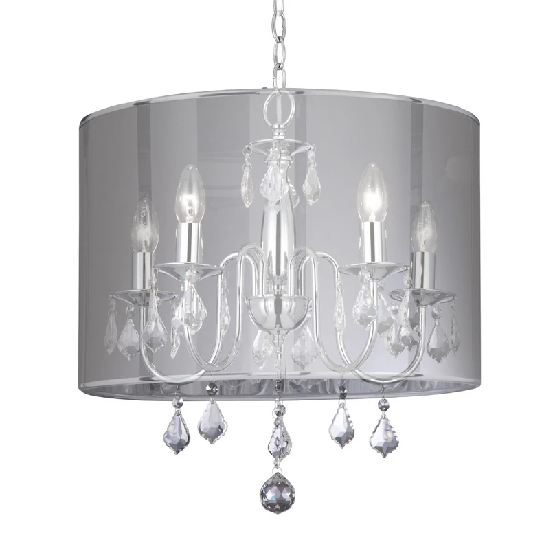 Trotz seiner klassischen Form versprüht der Kronleuchter OLIVIA modernes Flair. Dies liegt vor allem an der Gestaltung im chromfarbenen Gestell, das von zahlreichen Glaskristallen in ansprechender Tropfenform ergänzt wird. Wie eine schützende Hülle scheint sich zudem der metallicfarbene transparente Schirm aus robustem Polycarbonat um den Kronleuchter zu legen. Damit werden nicht nur moderne Akzente gesetzt, sondern auch das Licht kann einen jeden Raum hell und gleichmäßig beleuchten.