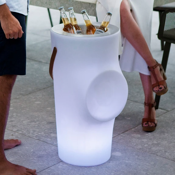 Gleich mehrere Funktionen erfüllt der Flaschenkühler Woody von Newgarden: Er sorgt für kühle Getränke, eine effektvolle Beleuchtung und für die passende Musik zu jedem Event. Der Kühler aus Polyethylen ist ein Entwurf des Designers Valerio Sommella. Das Material Polyethylen macht ihn zu einem robusten, im Temperaturbereich von - 45 bis 55 °C verwendbaren Lichtobjekt, das via Bluetooth-Verbindung Playlists vom Smartphone, Tablet oder einem anderen Gerät wiedergeben kann. Der Korpus des Kühlers kann dank der integrierten LEDs farbig oder auch in weißem Licht leuchten, die Lichteinstellungen und auch die Einstellungen des Lautsprechers lassen sich über die mitgelieferte Infrarot-Fernbedienung steuern. Ganz ohne störendes Kabel ist sich der beleuchtete Flaschenkühler mit Lautsprecher für 8 bis 10 Stunden autark überall im Außenbereich nutzbar, der leere Akku kann über das mitgelieferte Ladekabel innerhalb von 4 bis 6 Stunden an der Steckdose wieder aufgeladen werden. Der praktische Tragegriff, der gleichzeitig eine schöne Zierde darstellt, besteht aus Kunstleder, der im Lieferumfang enthaltene Einsatz aus Aluminium.