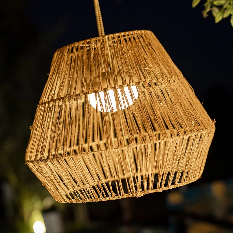 Die LED-Hängeleuchte Sisine lässt sich überall nutzen, denn sie benötigt dank des integrierten Akkus keinerlei Anschluss. Der aus Naturfasern gestaltete Schirm lässt sich an dem drei Meter langen Seil, an dem er befestigt ist, überall anbringen, ob unter einem Dach, an der Terrassenüberdachung, in einem Baum oder auch in Innenräumen. Die Hängeleuchte wird inklusive einer Fernbedienung geliefert. Über diese lässt sich das Licht in drei Helligkeitsstufen schalten. Je nach gewählter Lichteinstellung beträgt die Leuchtdauer mit einem vollen Akku bis zu 20 Stunden.