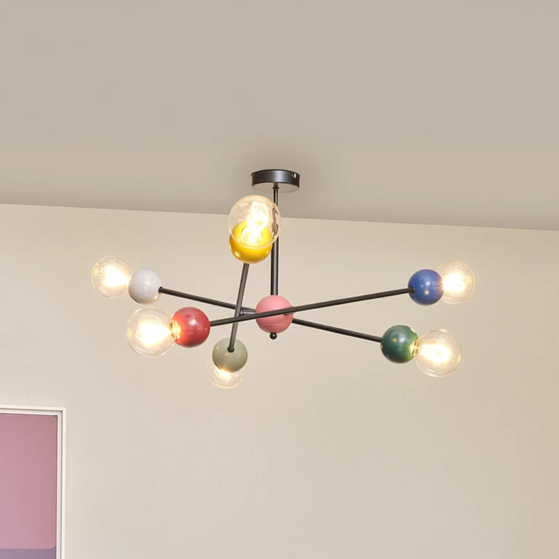 Die Deckenlampe Decor Bubble vereint modernes Design mit einer bunten Farbgestaltung. Gefertigt aus hochwertigem Stahl mit schwarzem Gestell und farbenfrohen, bunten Schirmen in Kugelform setzt sie stilvolle Akzente in jedem Raum. Mit sechs Lichtquellen sorgt sie für eine gleichmäßige und angenehme Ausleuchtung, die sich ideal für Wohnräume wie Wohnzimmer, Schlafzimmer, Kinderzimmer oder Flurbereiche eignet.