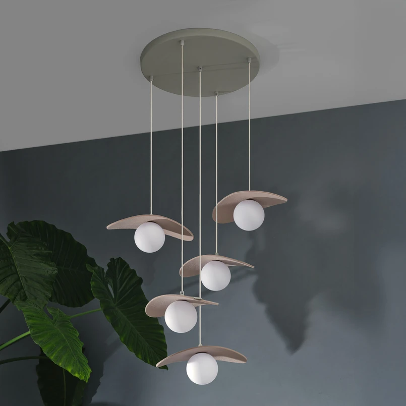 Die Hängeleuchte Decor Pearl vereint modernes Design mit hochwertigen Materialien wie Filz, Stahl und Glas. Die Kombination aus beige-weißer Farbgebung und der 5-flammigen Konstruktion sorgt für eine harmonische Lichtverteilung, die sowohl in Ess- als auch in Wohnzimmern eine stilvolle Atmosphäre schafft.