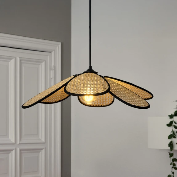 Die Hängeleuchte Decor Rattan Daisy vereint mediterrane Leichtigkeit mit dem natürlichen Material Rattan, das zu einzelnen Blättern geflochten und zu einem Schirm in der Form einer Blüte zusammengesetzt wurde. Das beige Rattangeflecht sorgt für eine warme, einladende Atmosphäre, während die schwarzen Akzente einen stilvollen Kontrast setzen. Die Leuchte fügt sich harmonisch in verschiedene Wohnbereiche wie Esszimmer, Wohnzimmer oder Schlafzimmer ein und wird so zum vielseitigen Gestaltungselement.
