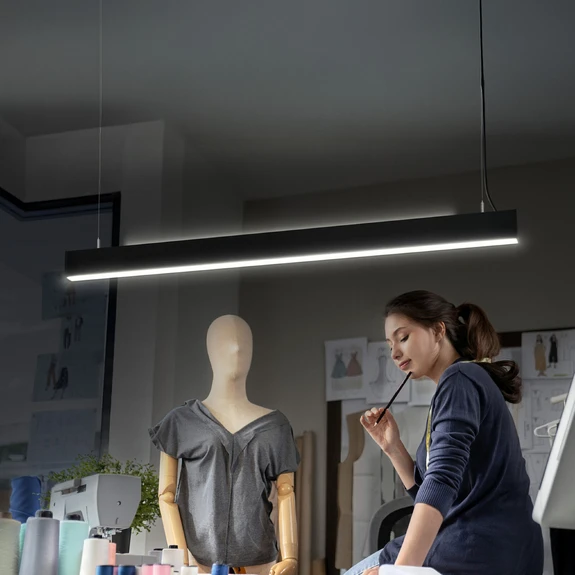 Cuboid aus der Reihe Office line von OSRAM ist eine 3-stufig-dimmbare Hängeleuchte für Büros, Heimarbeitsplätze oder die allgemeine Innenbeleuchtung in Küchen und Arbeitsbereichen. Die in der Leuchte verbauten LEDs spenden energieeffizientes, universalweißes Licht, das durch den Diffusor homogen abgestrahlt wird. Die lineare Leuchte in modernem Design lässt sich über den Schalter auf der Oberseite der Leuchte 3-stufig dimmen und strahlt einen Teil des Lichts nach oben ab, so dass zusätzlich zur direkten Beleuchtung der Arbeitsfläche indirekt der gesamte Raum angenehm beleuhtet wird. Im Lieferumfang ist das vollständige Montage- und Anschlusszubehör enthalten.