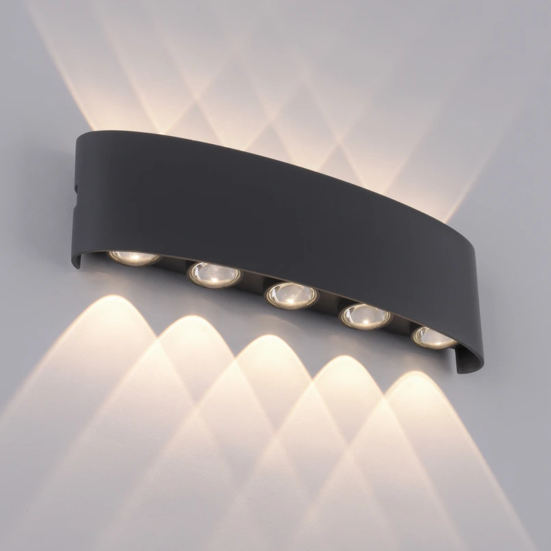 Die LED-Wandlampe Carlo in Anthrazit besticht durch ihr modernes und schlichtes Design. Die fünf Leuchtmittel oben und unten an der halbrunden Leuchte erzeugen dekorative Lichtkegel, die sich überschneiden und ein ansprechendes Lichtbild an den Wänden schaffen. Insgesamt sind zehn warmweiße LEDs fest verbaut. Die LED-Technologie sorgt für Energieeffizienz, geringe Wärmeentwicklung und eine lange Lebensdauer. Dank der Schutzart IP54 ist die Wandleuchte sowohl für den Innen- als auch den Außenbereich geeignet. Setzen Sie stilvolle Akzente rund um Ihr Haus mit dieser modernen LED-Wandleuchte.