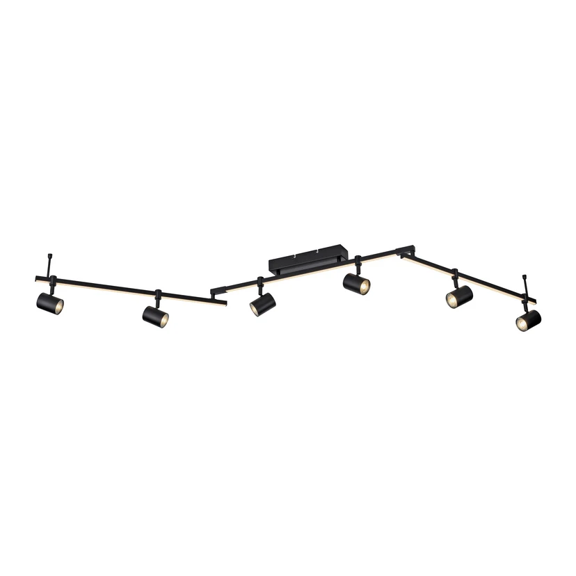 Die schwarze Spot-Deckenleuchte Barik besticht mit einem technisch-modernen Design. Die sechs Spots der Deckenleuchte sind sowohl schwenkbar als auch auf der Schiene justierbar und können so im Raum optimal ausgerichtet werden. Durch eine Farbtemperatur von 3.000 Kelvin gibt die Deckenlampe ein angenehm warmweißes Licht ab. Die Schiene, an dem die Spots befestigt sind, ist zusätzlich mit einer LED-Leiste ausgestattet und sorgt somit für das gewisse Etwas. Durch den integrierten Serienschalter ist es mithilfe des Wandschalters möglich, beide Lichtquellen gemeinsam einzuschalten, nur das Licht an der Leiste leuchten zu lassen oder aber lediglich die Spots einzuschalten. Sechs GU10 Leuchtmittel sind im Lieferumfang enthalten. Über die Memory Funktion werden Ihre letzten Einstellungen automatisch gespeichert. Die Deckenleuchte ist durch die geringe Abhängung auch für Räume mit geringer Deckenhöhe geeignet.
