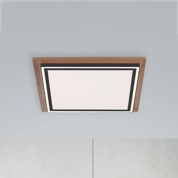 Die LED-Deckenleuchte Palma zeichnet sich durch ihr schönes Design aus. Die Kombination aus dunklem Holzdekor der großen Metallplatte, matt-schwarzem Metall als feine Rahmen und satiniertem Kunststoff als Abdeckung verleiht der Leuchte eine modische, jedoch nicht zu dominante Optik, so dass sich die flache Leuchte in viele Einrichtungen integrieren lässt. Das LED-Panel wird mit einer Fernbedienung geliefert und bietet durch die CCT-Funktion die Auswahl der Lichtfarbe im Bereich von warmweißer bis zu universalweißer Beleuchtung, die Helligkeit lässt sich stufenlos dimmen und die beiden in der Leuchte verbauten LED-Boards (schmaler Rand oder innere große Fläche) lassen sich getrennt voneinander oder zusammen einschalten. Damit ermöglicht die LED-Deckenleuchte Palma eine individuelle Lichtgestaltung, die jedem Bedürfnis angepasst werden kann. Die gewählte Einstellung wird durch die Memory-Funktion gespeichert, und zwar so lange, bis eine neue Auswahl vorgenommen wird.