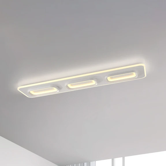 Die LED-Deckenlampe Q-Kalina vereint ein schlichtes Design mit vielseitigem Licht. Der flache, rechteckige Eisenkorpus in weißer Farbgebung ist an der Unterseite mit drei abgesetzten Rechtecken versehen. An deren Innenseiten sowie an der Außenseite des Korpus ist jeweils ein LED-Ring integriert.