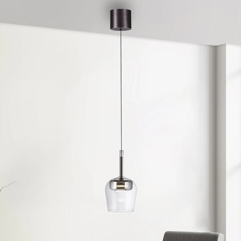 Die LED-Hängeleuchte Q-Kon ist äußerlich wie funktional eine Bereicherung für modern eingerichtete Wohn- und Aufenthaltsräume. Der Lampenschirm setzt sich aus einem gewölbten, unten zulaufenden transparenten Glas und einem innen liegenden Aluminiumkorpus im farbig-metallischen Finish zusammen. Das nach unten strahlende LED-Modul gewährt eine direkte Tisch- oder Bereichsbeleuchtung. Dank Comfort Lift ist eine manuelle Justierung der Abpendelhöhe jederzeit möglich.