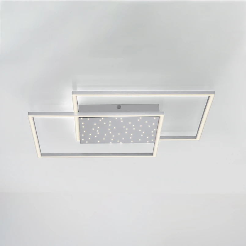 Die in eckigem Design gestaltete LED-Deckenleuchte Yuki setzt sich aus zwei schlanken, rechteckigen Rahmen mit darin flächig strahlenden LED-Boards und einem quadratischen Mittelteil mit LED-Sternenhimmel zusammen. Die beiden Lichtquellen Rahmen und Sternenhimmel können unabhängig voneinander geschaltet werden oder auch gleichzeitig leuchten. Dank CCT-Lichtmanagement können alle Bereiche der Leuchte in der Lichtfarbe von warmweiß bis universalweiß eingestellt werden und die Beleuchtung kann gedimmt werden. Diese variablen Einstellungen der Leuchte, ganz bequem per Fernbedienung vorzumehmen, ermöglichen eine zu jeder Situation passende Beleuchtung, ob im Wohnraum oder in anderen Bereichen.